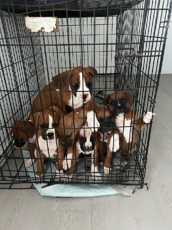 8 Boxer puppies are looking for a new forever home. 3 Females and 5 Males. All of them have their first round of vaccines.